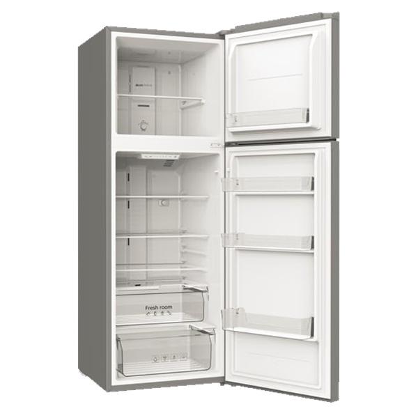 AKAI 220 Liters Double Door Top Mount Free Standing Total No Frost Refrigerator. Glass Shelves Titanium Finish R600a Refrigerant 4 Stars ESMA Ratings One Year Service Warranty New Edition RFMA-S265WTA