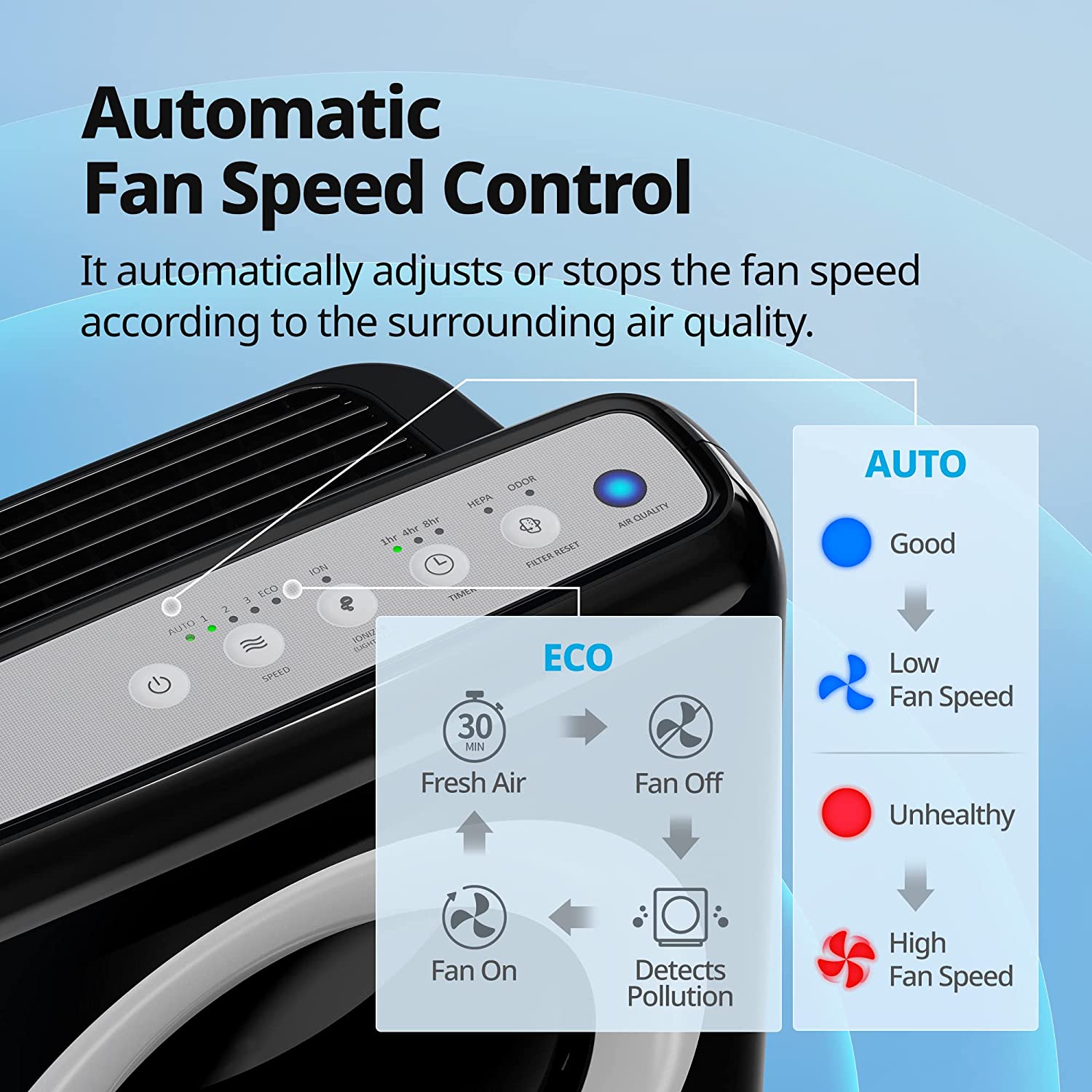• Fan speeds available in 1, 2, 3 stages by manually setting up. While auto mode automatically optimizes the speed setting 1 through 3 based on the level of indoor air quality. When no pollution is detected for 30 minutes, the fan will automatically stop and set as Eco mode to save energy.