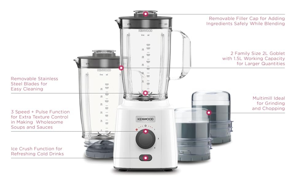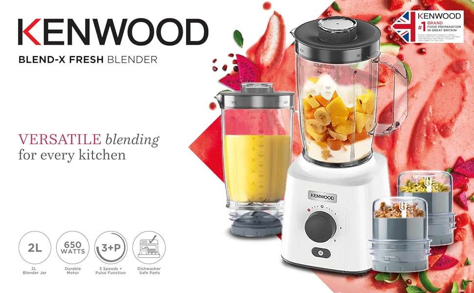 Kenwood Blender 650W Smoothie Blender/Smoothie Maker Blend-X Fresh 1.5L With Extra Blender Jar, Grinder Mill, Grater Mill, Ice Crush Function Blp41.H0Wh – White